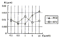 由圖3所示工件表面粗糙度試驗曲線可知,當進給量f≤4µm/r時,PCD刀具和SPD刀具加工出的工件表面粗糙度均可達到超精加工表面質量要求(Ra≤0.01um);