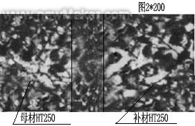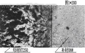 3.1.2 將焊補(bǔ)處進(jìn)行打磨、拋光,制作金相分析試片,金相組織如圖1、圖2。圖1左邊為母材HT250,右邊為0.8#補(bǔ)材,圖2左邊為母材HT250,右邊為HT250鐵屑補(bǔ)材。焊補(bǔ)處未見明顯分界線、過渡區(qū)域微小、焊補(bǔ)點(diǎn)附近未見碳化物析出、焊補(bǔ)處金屬組織致密,未見裂紋的產(chǎn)生。結(jié)論:宏觀檢測(cè),焊補(bǔ)點(diǎn)附近及整個(gè)試棒常溫,焊補(bǔ)點(diǎn)金屬顏色與母材相同,補(bǔ)材為0.8#的焊補(bǔ)點(diǎn)比母材更致密,補(bǔ)材為同材質(zhì)的焊補(bǔ)點(diǎn)與母材致密度相同,金相組織分析:無裂紋、周邊金相組織未改變、無內(nèi)應(yīng)力,未出現(xiàn)硬化、軟化現(xiàn)象。