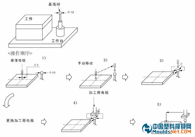 對于數(shù)控放電機(jī),推薦使用基準(zhǔn)球分中的方法,這是模具工廠放電必備的方法。通常的做法是: