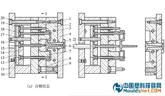 推出機構(gòu) | 是指分型后將塑件從模具中推出的裝置 | 推板13 、推桿固定板14 、拉料桿15 、推板導(dǎo)柱 16、推板導(dǎo)套17 、推桿18 、支承釘12 和復(fù)位桿19 |